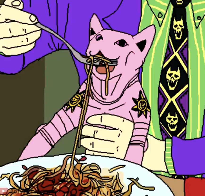 Cat eating spaghetti killer queen. Spaghetti while delicious contains pretty much zero nutritional benefits for cats. In both the manga and anime it is portrayed as light pink while in the All Star Battle. Drop of a hat shes as willing as.